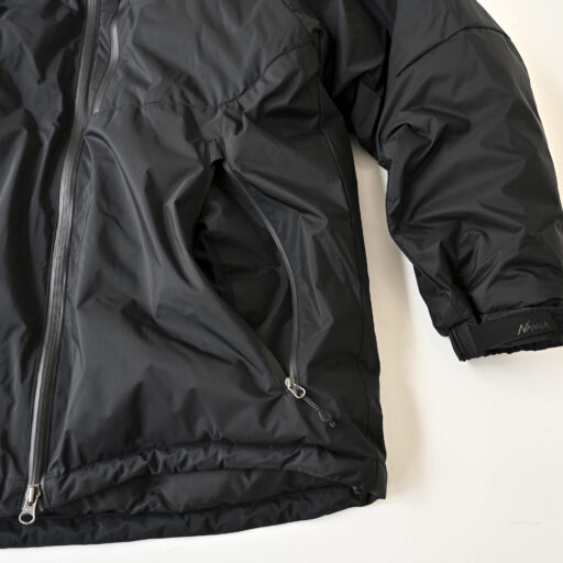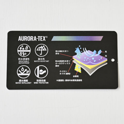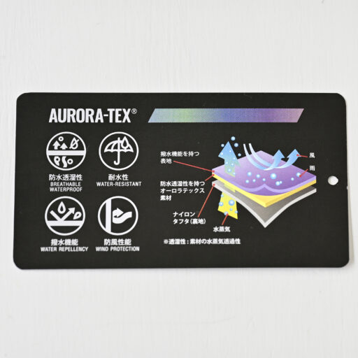 表地には、NANGAオリジナル防水透湿素材「オーロラテックス」を使用。耐水圧20,000mmで、雨などの侵入を防ぎます。また、透湿性にも優れ(6,000g/m2/24hrs)、衣類内が蒸れることなく、ドライで快適な着心地をキープ。