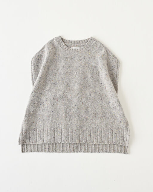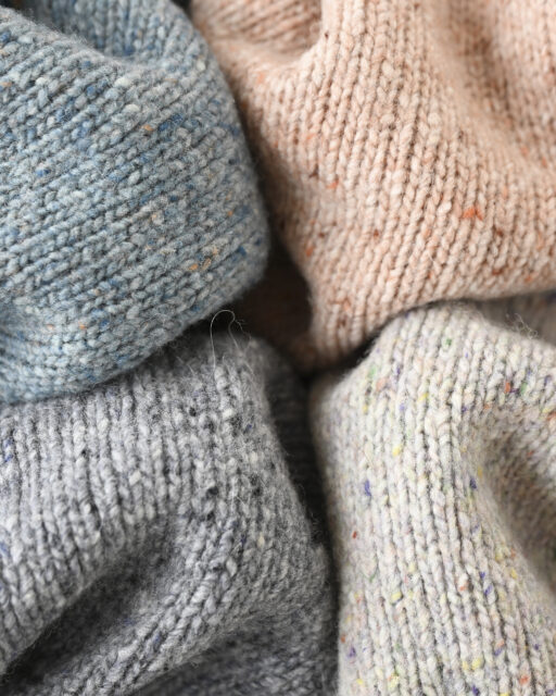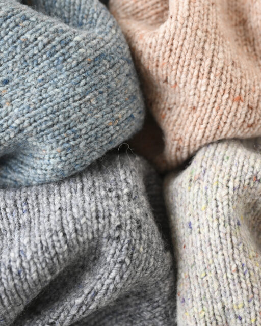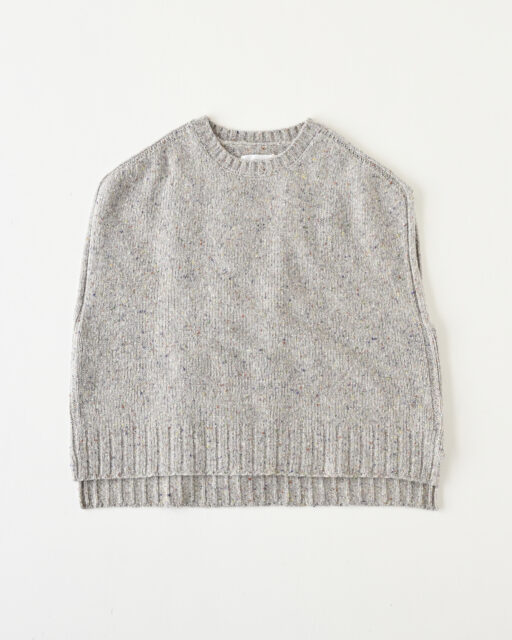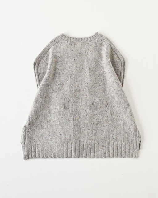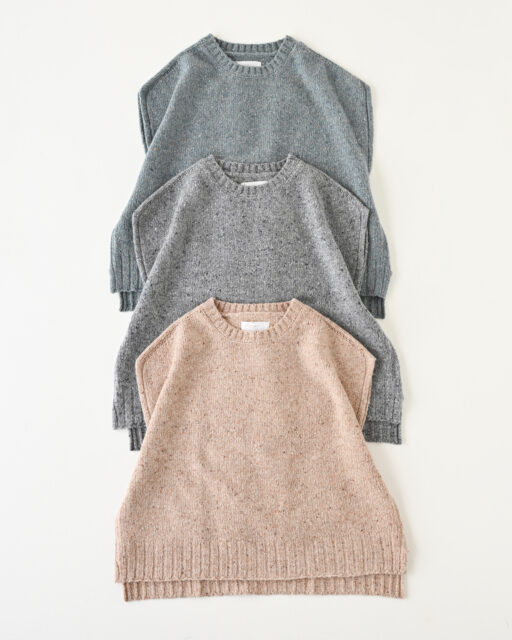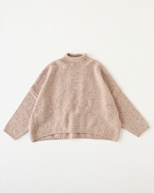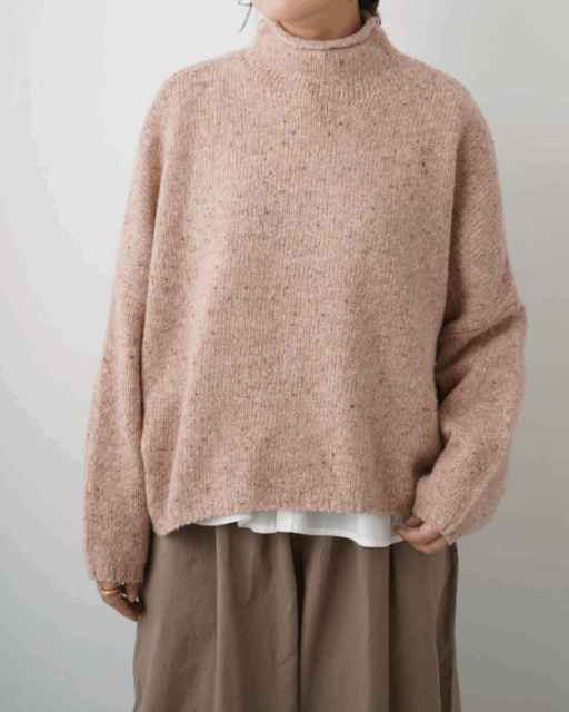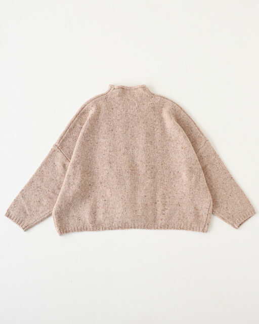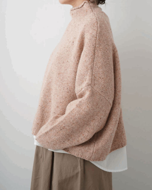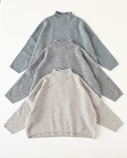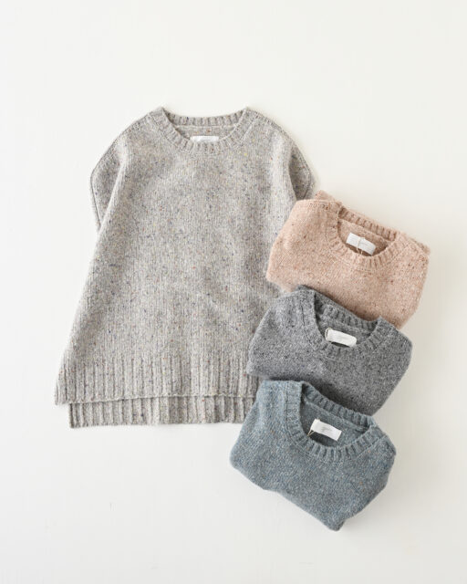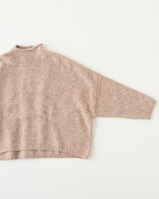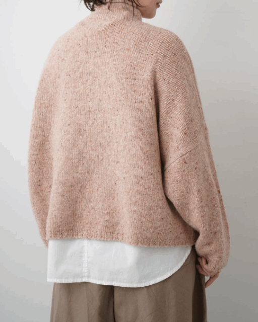 ローゲージですが、程よい厚みにすることで着膨れしにくくなっています。生地全体に、ぽつぽつとした節のようなカラーネップが現れており、独特の表情がポイントに◎
