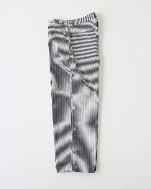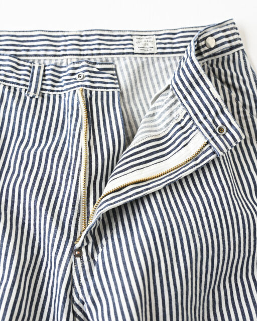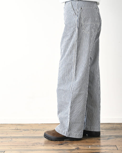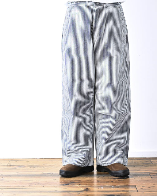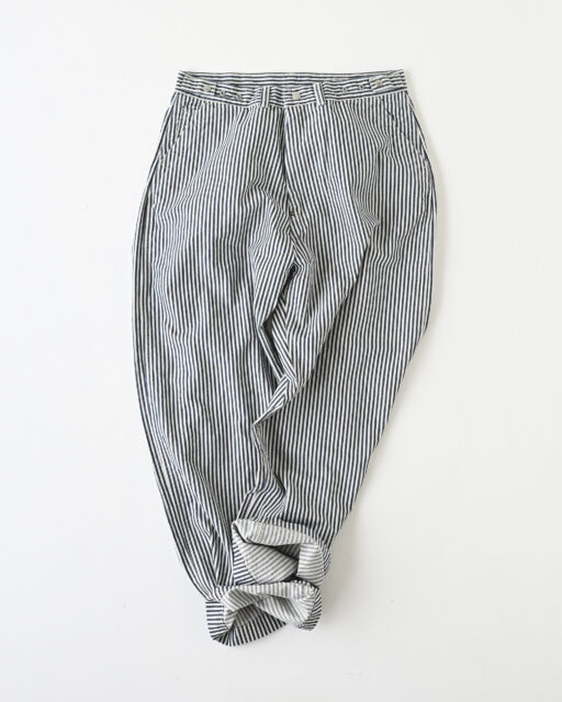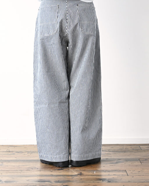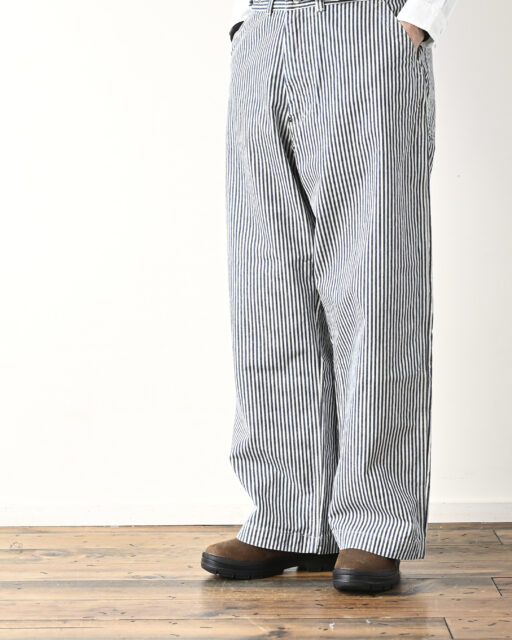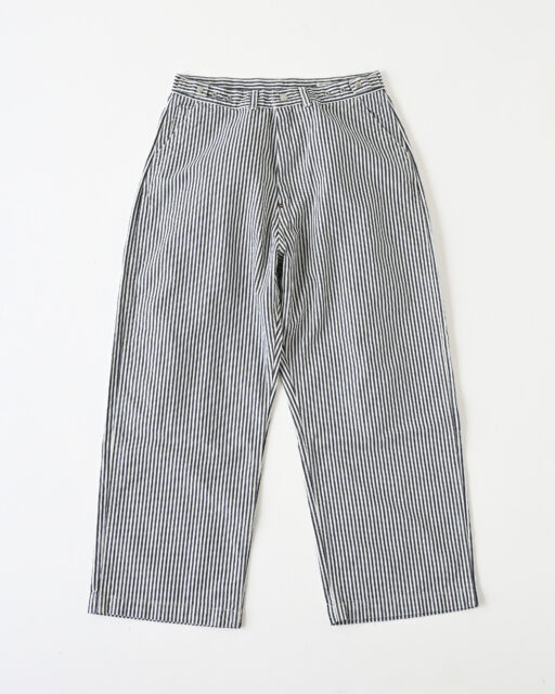 Ordinary fits(オーディナリーフィッツ)のユニセックスで楽しめるヒッコリー柄のベルパンツ。10.5オンスのライトオンスデニム生地を使用。