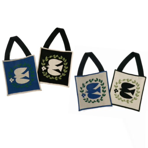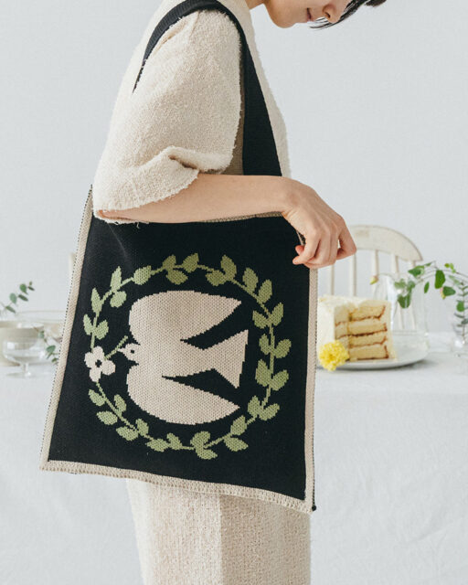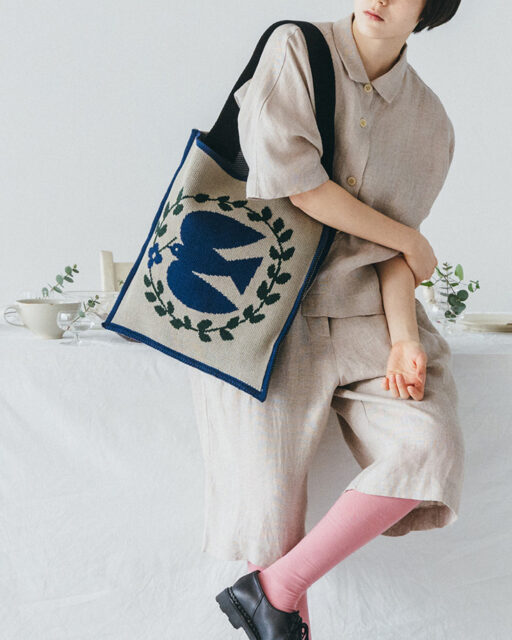 綿糸で度詰めに編み立てた、 ジャガード柄のニットショルダーバッグです。 切手に描かれているような鳥をモチーフにしたレトロなデザインです。