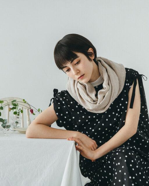 ざっくりとしたリネンガーゼ生地と薄いコットン天竺ニット生地を合わせた スヌードです。