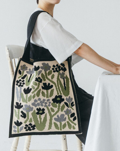 綿糸で度詰めに編み立てた、 ジャガード柄のニットショルダーバッグです。 風に揺れる花々をモチーフにしたデザインです。