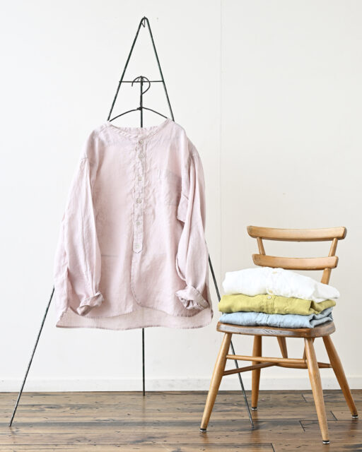 程よくゆとりのあるワイドシルエットに、すっきりとしたバンドカラーがポイントのリネンシャツです。