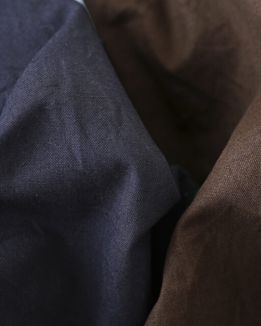 素材は、経糸にムラの空紡糸、緯糸に綿ヘンプ糸を打ち込んだオリジナルのダック地。